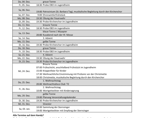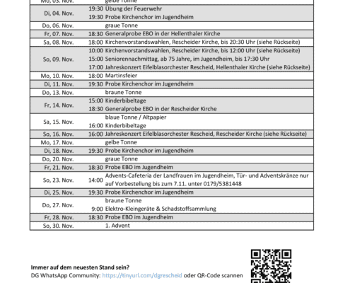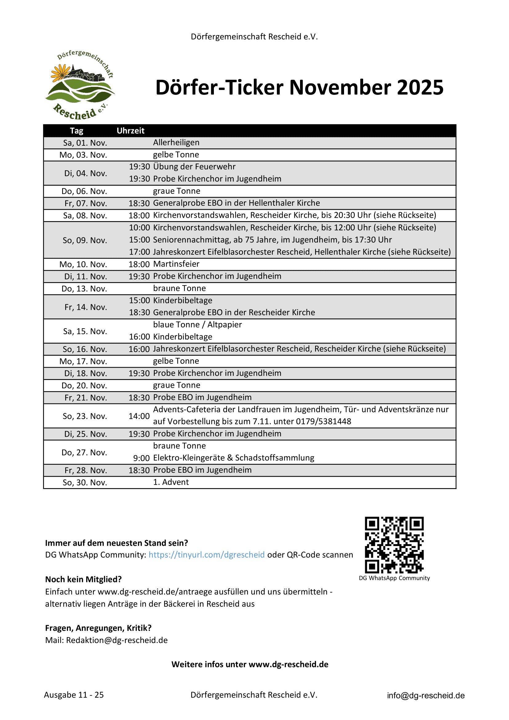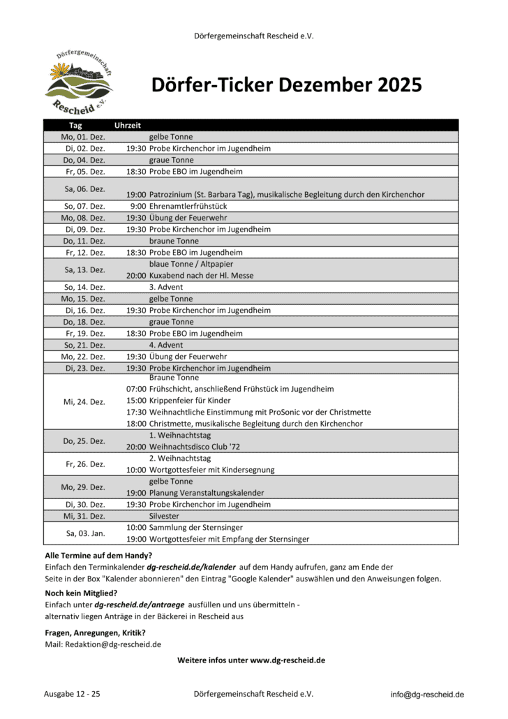 Ergänzend zum jährlich erscheinenden Veranstaltungskalender erscheint zusätzlich einmal pro Monat unser Dörfer-Ticker. Hier findet Ihr neben dem monatlichen Abfallkalender und den Veranstaltungen des Monats immer aktuelle Informationen aus der Dörfergemeinschaft. Meldet Euch gerne bei Themenvorschlägen und -ideen unter redaktion@dg-rescheid.de